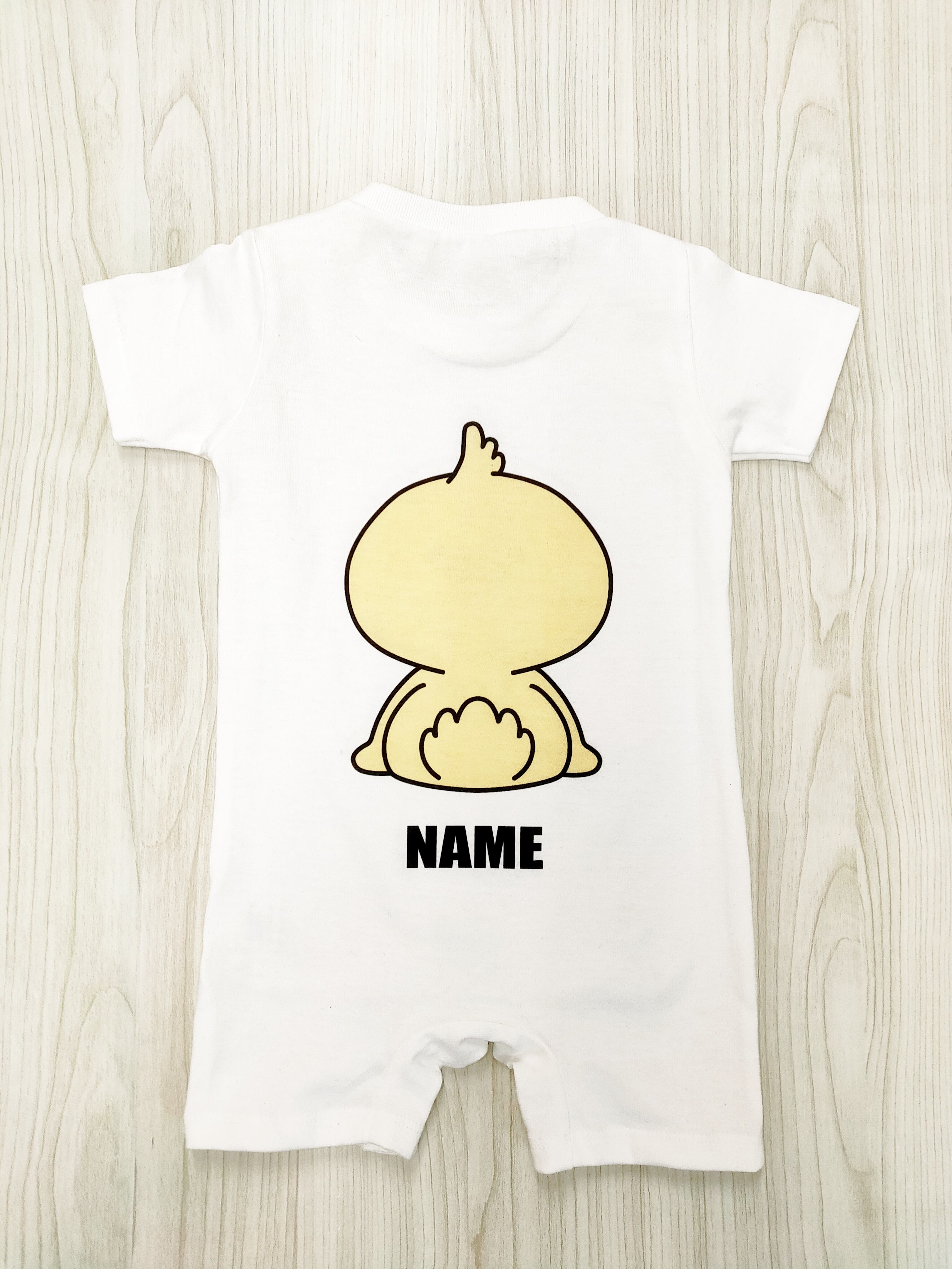 ロンパースの表面と背面にキャラクターの正面と後姿がプリントされています。